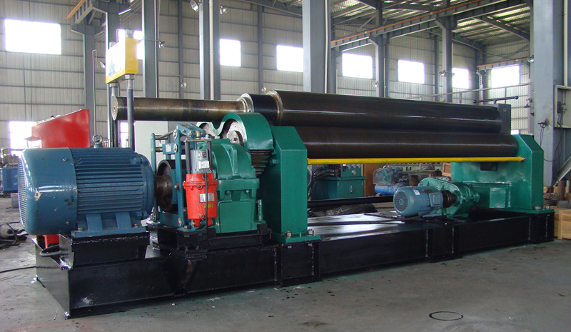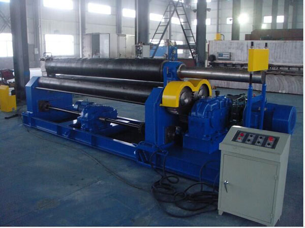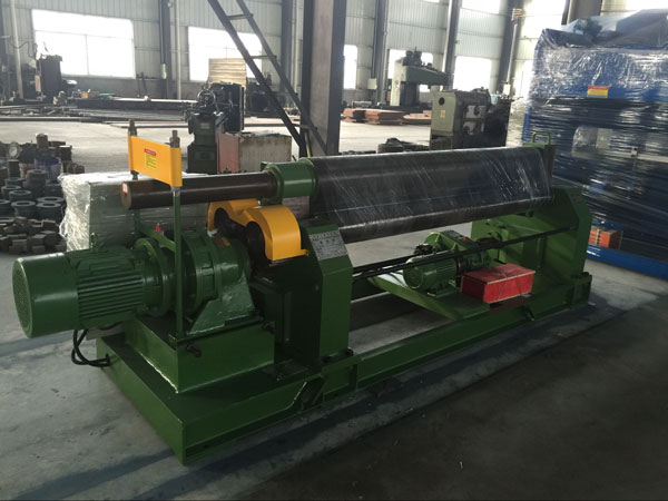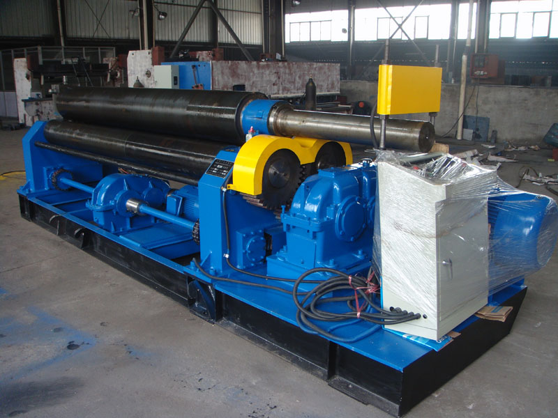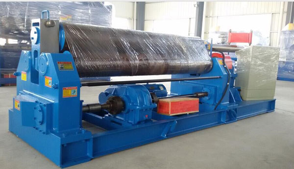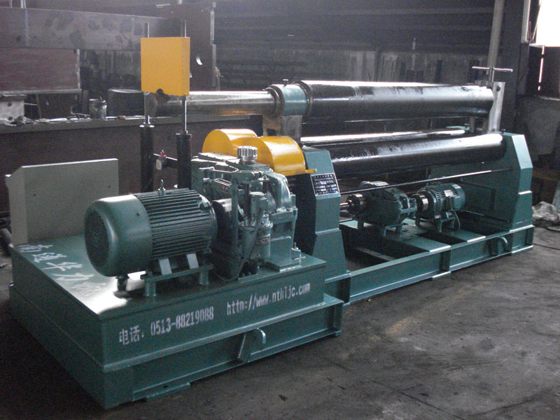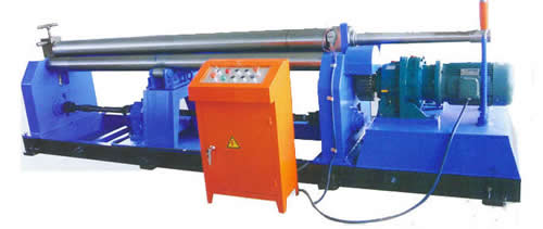 该机结构形式为三辊对称式,上辊在两下辊中央对称位置作垂直升降运动,通过丝杆螺母蜗杆转动而获得,两下辊作旋转运动,通过减速机的输出齿轮与下辊齿轮齿合,为卷制板材提供扭矩。该机缺点是板材端部需借助其它设备进行预弯。
